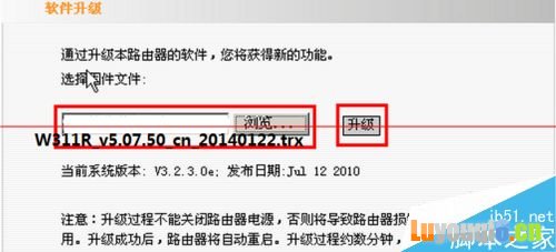 10、点击升级界面的选择,找到您存放解压后的W311R_v5.07.50_cn_20140122.trx 。选择升级,等待升级完成,进度条完成后请在等20秒