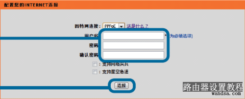 从图中可以看到路由器已经成功侦测出我当前的上网类型是静态IP,已经成功连接到internet。 如果是家庭ADSL或小区宽带用户,这里会弹出PPPOE的设置界面,如下图所示: