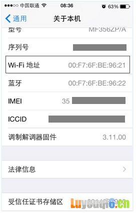 在关于本机的主菜单中,Wi-Fi(或无线局域网地址)即为设备的MAC地址。