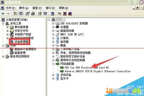 2、在打开的“计算机管理”窗口中,点击“系统工具”下的“设备管理器”。随后右侧寻找“网络适配器”,下方第一个适配器显示红色“X"。说明已暂停启动设备。