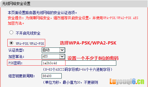 进入 无线设置 >> 无线安全设置,选择 WPA-PSK/WPA2-PSK,设置一个不少于8位的PSK密码,点击页面最下方的 保存。