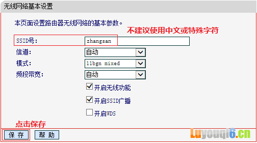 登录管理界面后,点击 无线设置 >> 基本设置,修改SSID号(即无线网络名称),其他设置保持默认,点击 保存。如下: