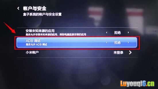 1)将小米盒子与电视连接,然后使用遥控器操作,依次进入【系统设置】--【账户与安全】,然后将ADB设置为 允许 即可。