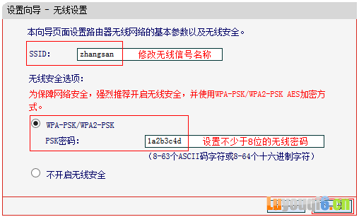 建议修改 SSID (即无线网络名称,可根据实际需求设置),选择 WPA-PSK/WPA2-PSK 的加密方式,在 PSK密码 的位置设置无线密码,点击 下一步。