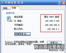 经过上面的配置后,您的电脑就会自动向路由器"索要"IP地址,路由器也会在接收到请求后分配参数给电脑,成功后点击电脑右下角的小电脑图标,在本地连接状态的"支持"选项卡里可以看到电脑获取的参数,如下图(以XP系统为例):