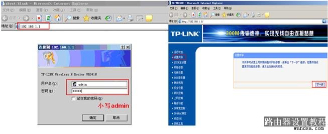 ①打开网页浏览器,在地址栏输入 http://192.168.1.1 打开路由器的管理界面,在弹出的登录框中输入路由器的管理帐号(用户名:admin 密码:admin); 如果无法打开路由器的管理界面,请检查输入的IP地址是否正确以及是否把"."输成了中文格式的句号。