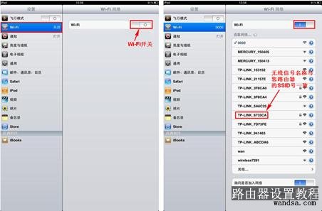 ③设置iPad、iPhone等IOS设备来连接路由器无线信号。 l 打开iPad主界面,选择"设置"菜单后点击Wi-Fi进入Wi-Fi网络界面。然后开启Wi-Fi总开关并在无线网络列表中单击您自己路由器的无线信号。