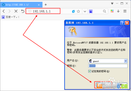 在地址栏中输入“ 192.168.1.1 ”路由器地址,敲打回车键。然后在弹出的路由器登陆框中输入“ 路由器用户名 + 登陆密码 ”进行登陆。